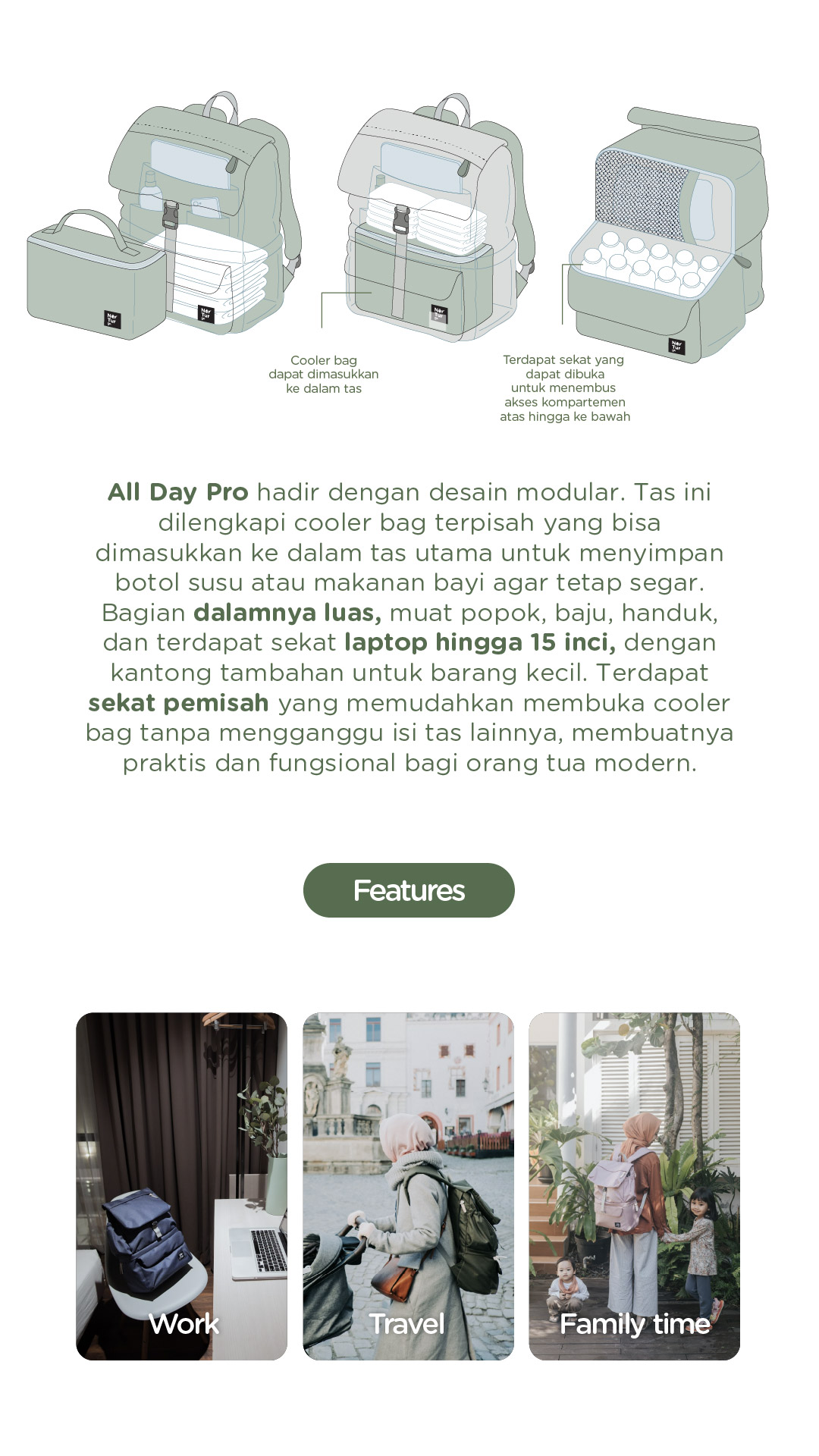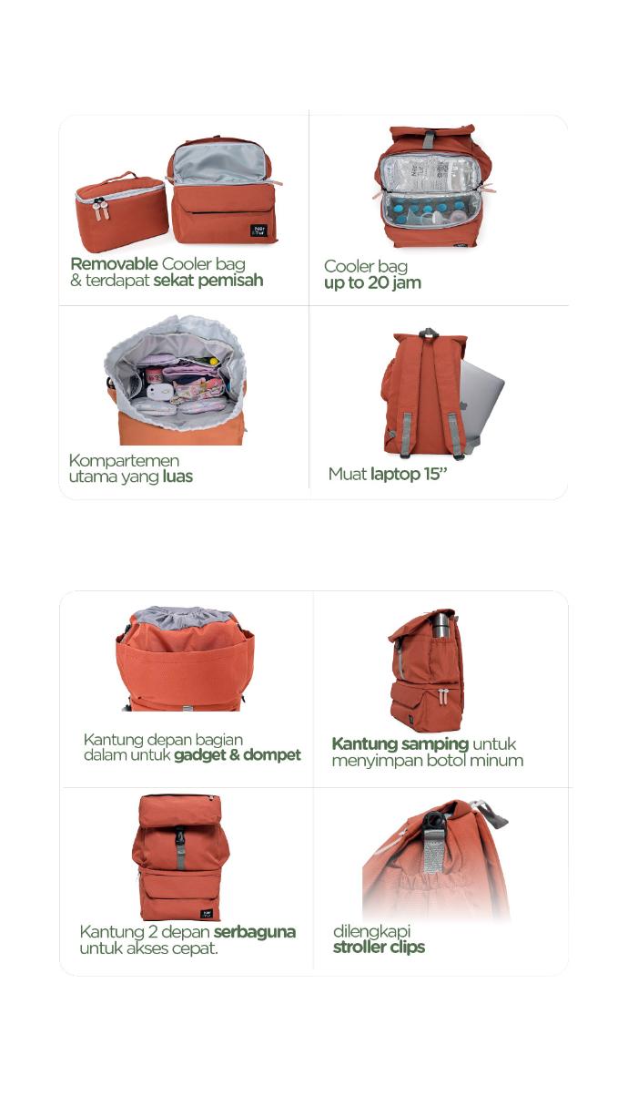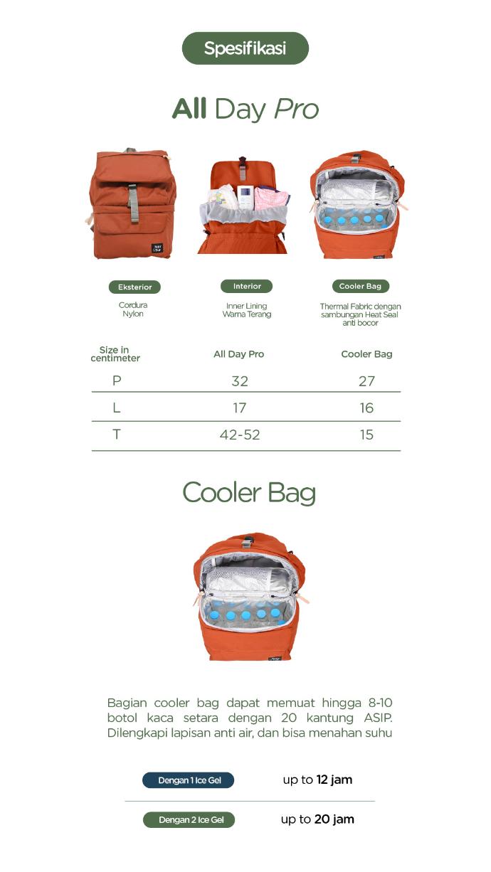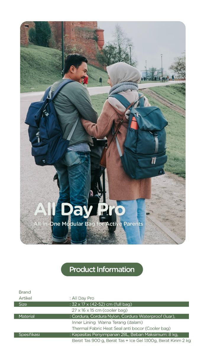 All Day Pro adalah Tas Ransel Modular yang didesain untuk orang tua yang membutuhkan membawa perlengkapan bayi dan laptop secara bersamaan. All Day Pro mampu memuat laptop hingga 15" dan memiliki cooler bag yang dapat dipisah. Kompartemen atas untuk menyimpan pakaian, popok, perlak dll. Sedangkan kompartemen bawah adalah cooler bag yang dapat dipisah mampu menahan temperatur lebih dari 12 Jam dengan 1 ice gel 500gr. Sangat cocok untuk bepergian dalam sehari penuh!