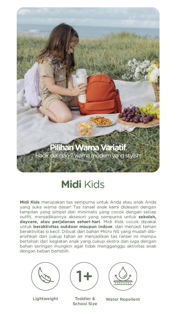 Midi Kids merupakan tas sempurna untuk Anda atau anak Anda yang suka warna dasar! Tas ransel anak kami didesain dengan tampilan yang simpel dan minimalis yang cocok dengan setiap outfit, menjadikannya aksesori yang sempurna untuk sekolah, daycare, atau perjalanan sehari-hari. Midi Kids cocok dipakai untuk beraktivitas outdoor maupun indoor, dan menjadi teman beraktivitas si kecil. Dibuat dari bahan Micro NS yang mudah dibersihkan dan cukup tahan air menjadikan tas ransel ini mampu bertahan dari kegiatan anak yang cukup ekstra dan juga dengan bahan seringan mungkin agar tidak mengganggu aktivitas anak dengan beban berlebih.