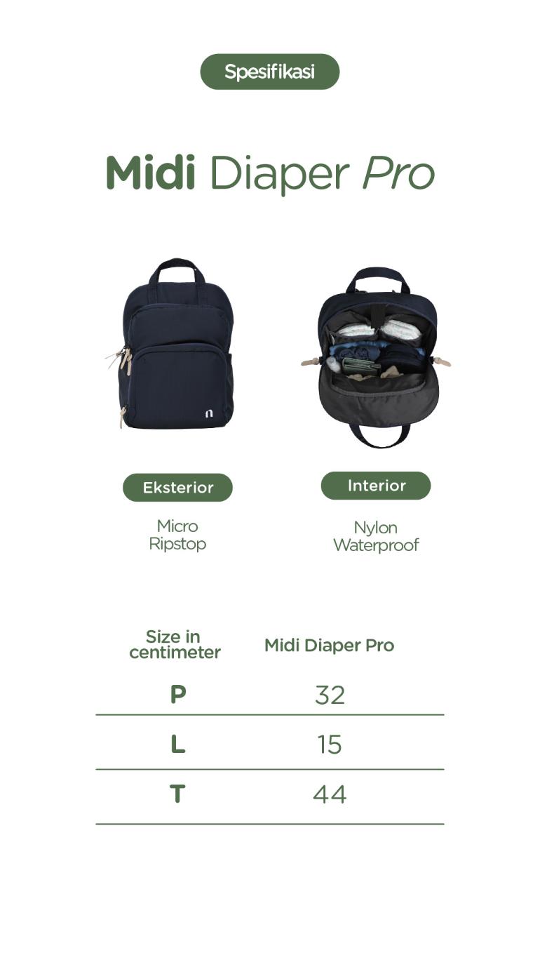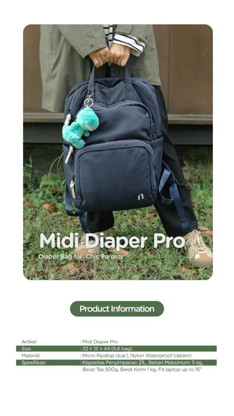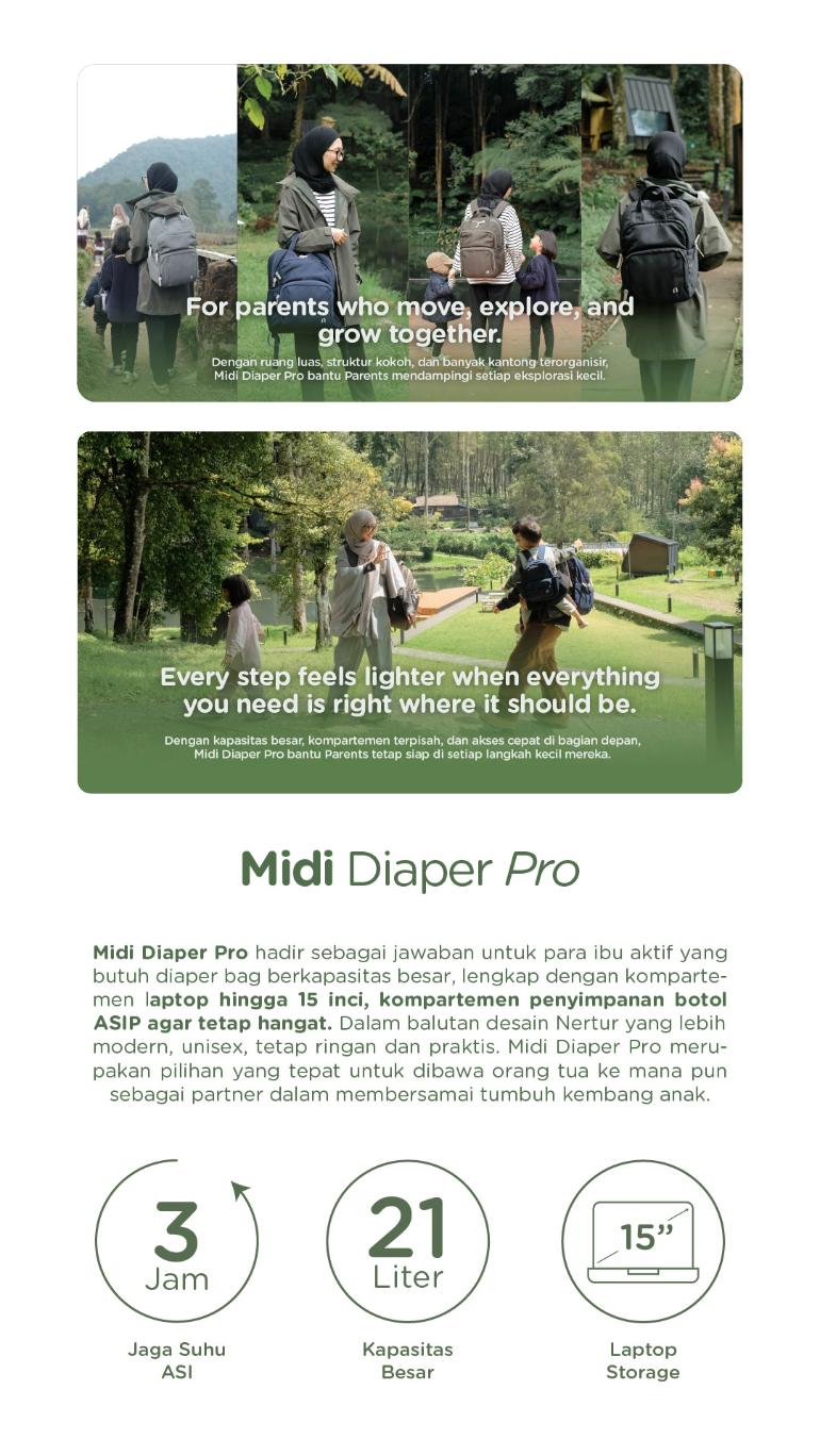 Midi Diaper Pro merupakan Diaper Bag yang memiliki kapasitas hingga 21 Liter dengan kompartemen laptop hingga 15”, kantung depan dengan lapisan Insulasi agar menjaga suhu tetap hangat dalam 1,5 jam dan dingin dalam 3 jam. Dalam balutan desain Nertur yang lebih modern namun tetap ringan dan praktis.