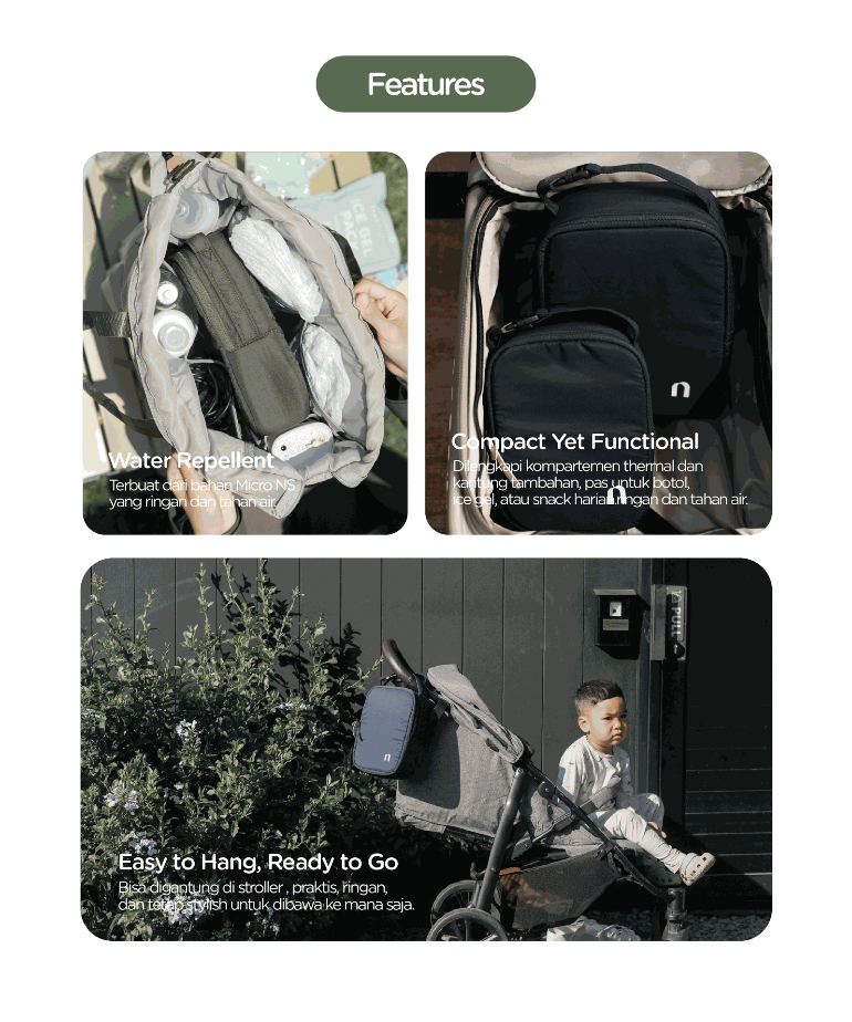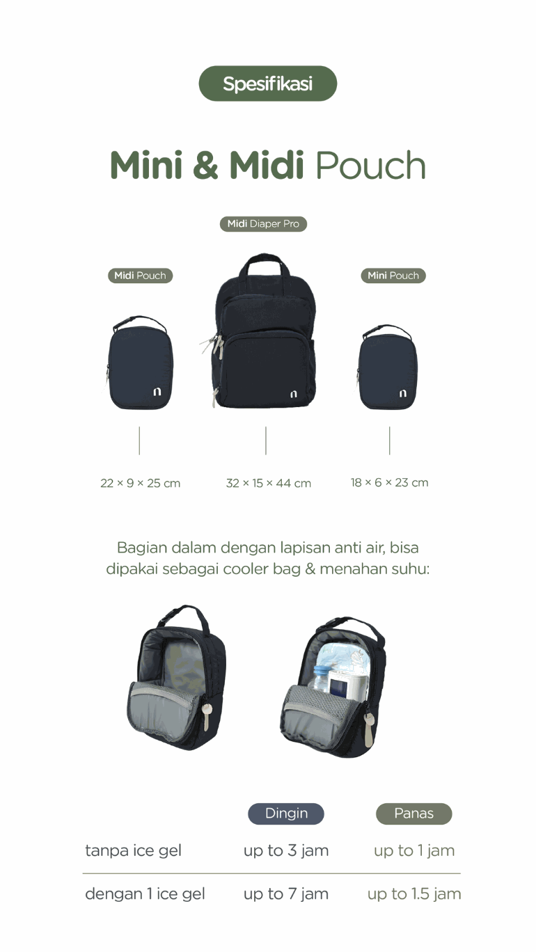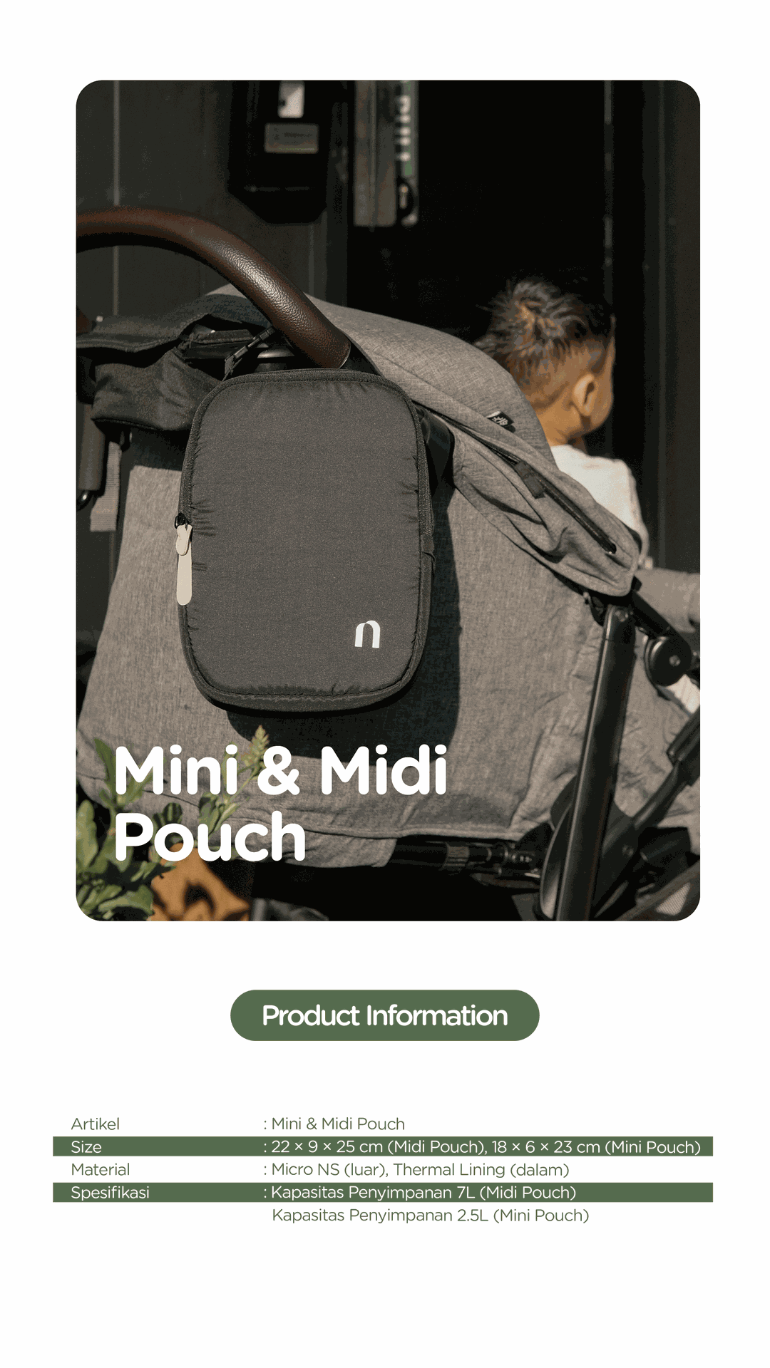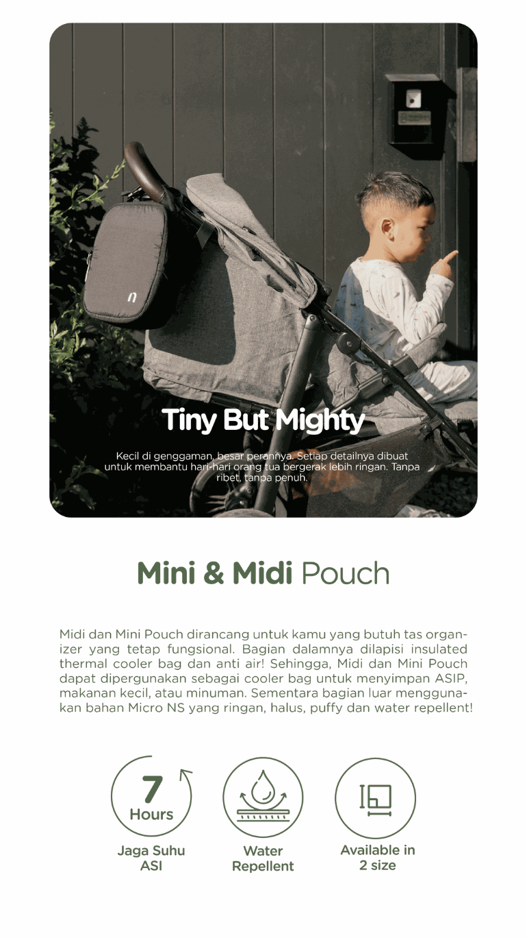 Midi dan Mini Pouch dirancang untuk kamu yang butuh tas organizer yang tetap fungsional. Bagian dalamnya dilapisi insulated thermal cooler bag dan anti air! Sehingga, Midi dan Mini Pouch dapat dipergunakan sebagai cooler bag untuk menyimpan ASIP, makanan kecil, atau minuman. Sementara bagian luar menggunakan bahan Micro NS yang ringan, halus, puffy dan water repellent!