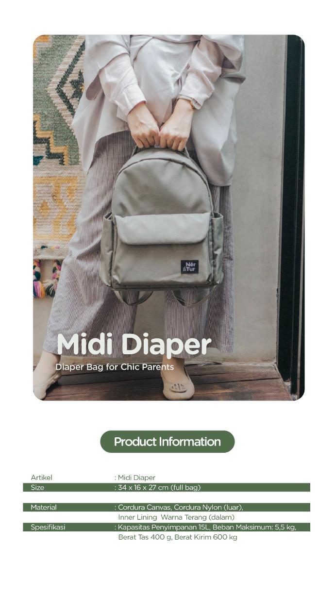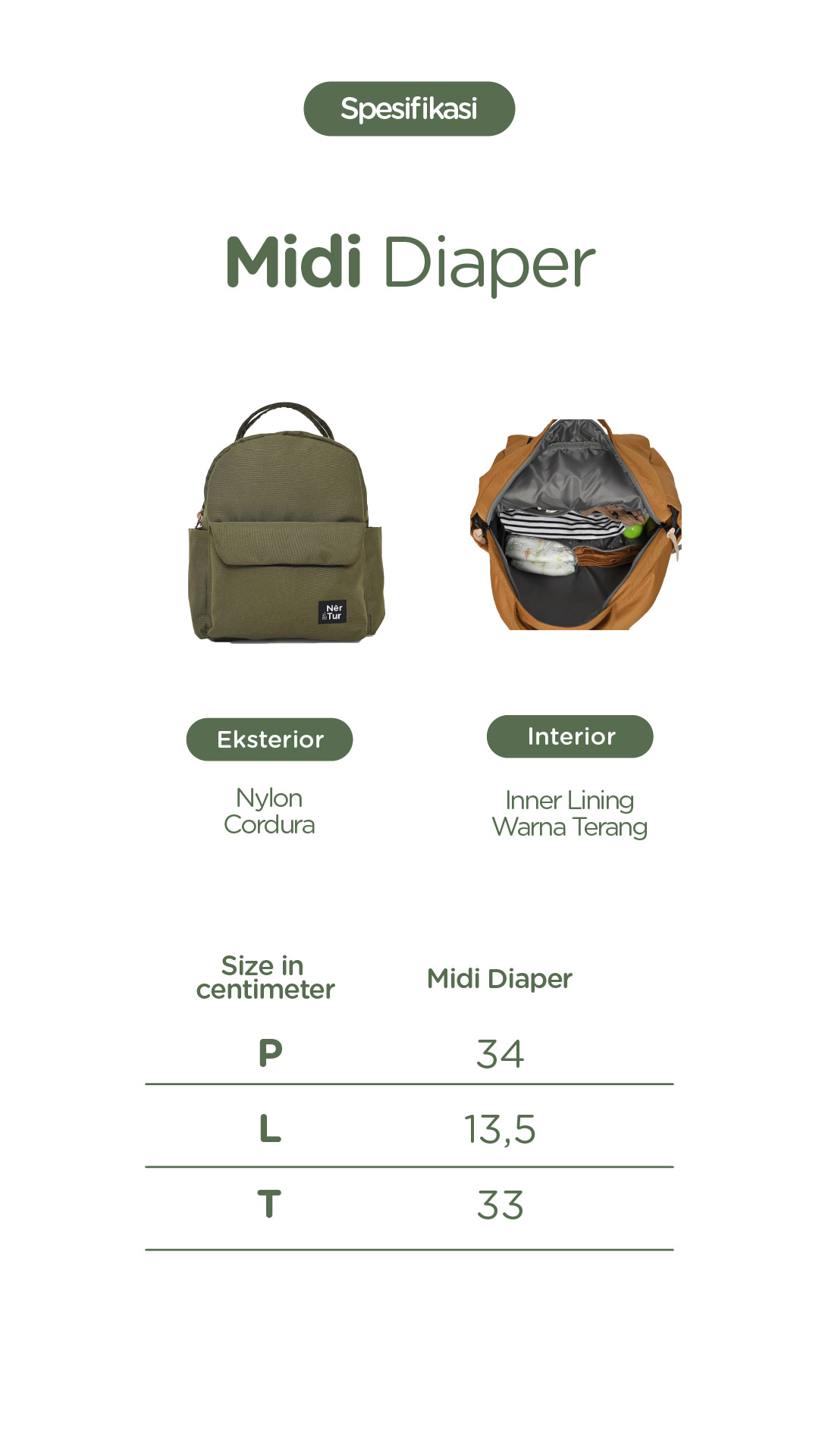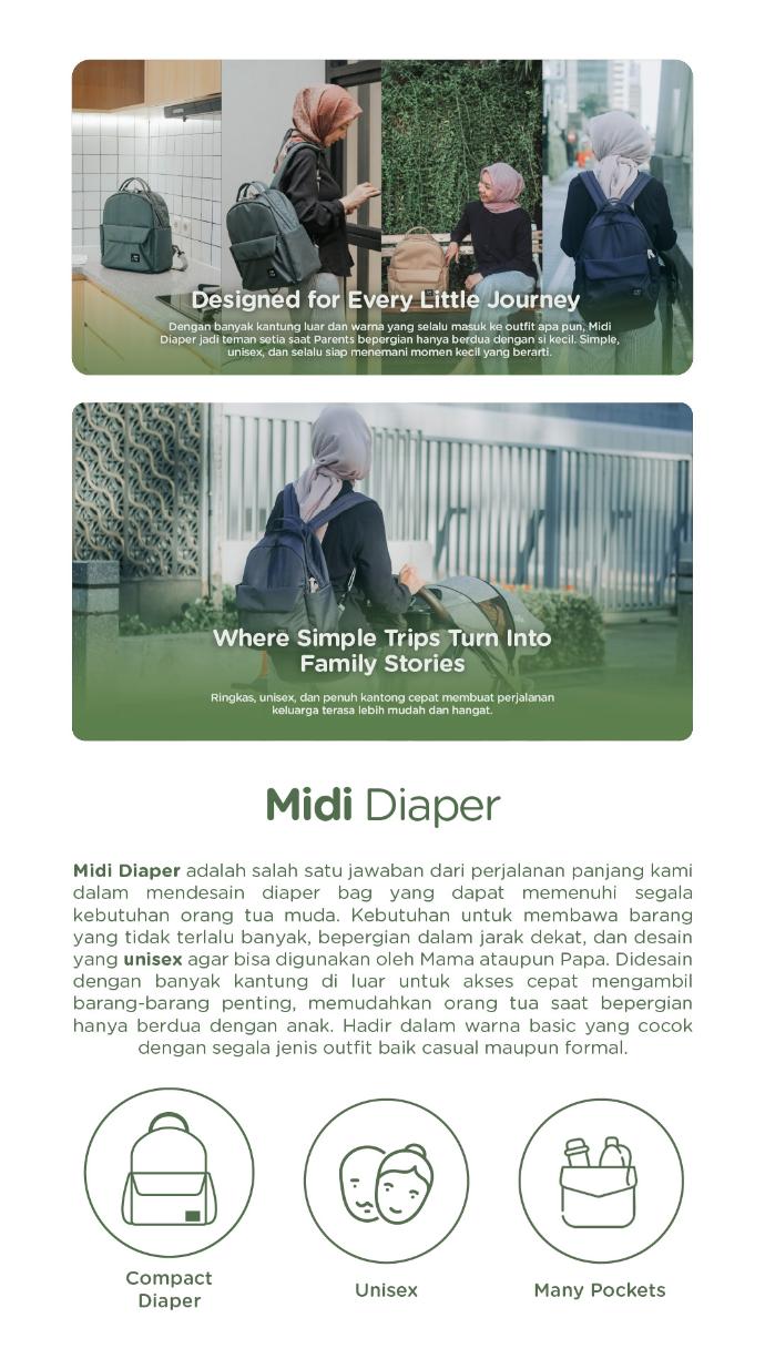 Midi Diaper adalah salah satu jawaban dari perjalanan panjang kami. Perjalanan dalam mendesain diaper bag yang dapat memenuhi segala kebutuhan kami, orang tua muda. Kebutuhan untuk membawa barang yang tidak terlalu banyak, bepergian dengan jarak yang dekat, dan desain yang unisex agar bisa digunakan oleh para Mama ataupun Papa.